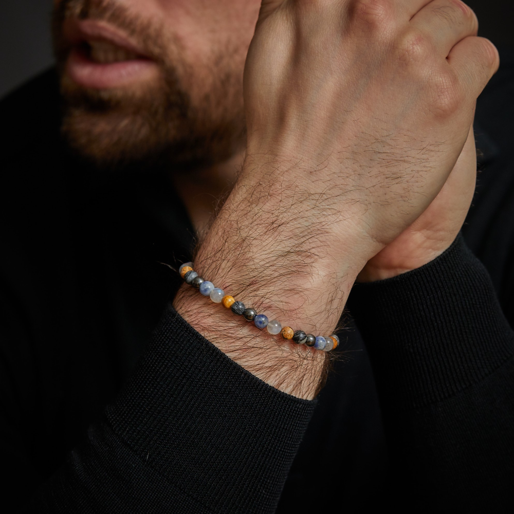 Armband van het merk Rebel & Rose. De armband heeft een hoogwaardige elastische stretch koord, met 6mm van Labradorite, Lithographic, Black Network, Hematite Grey, Blue Spot Stone.