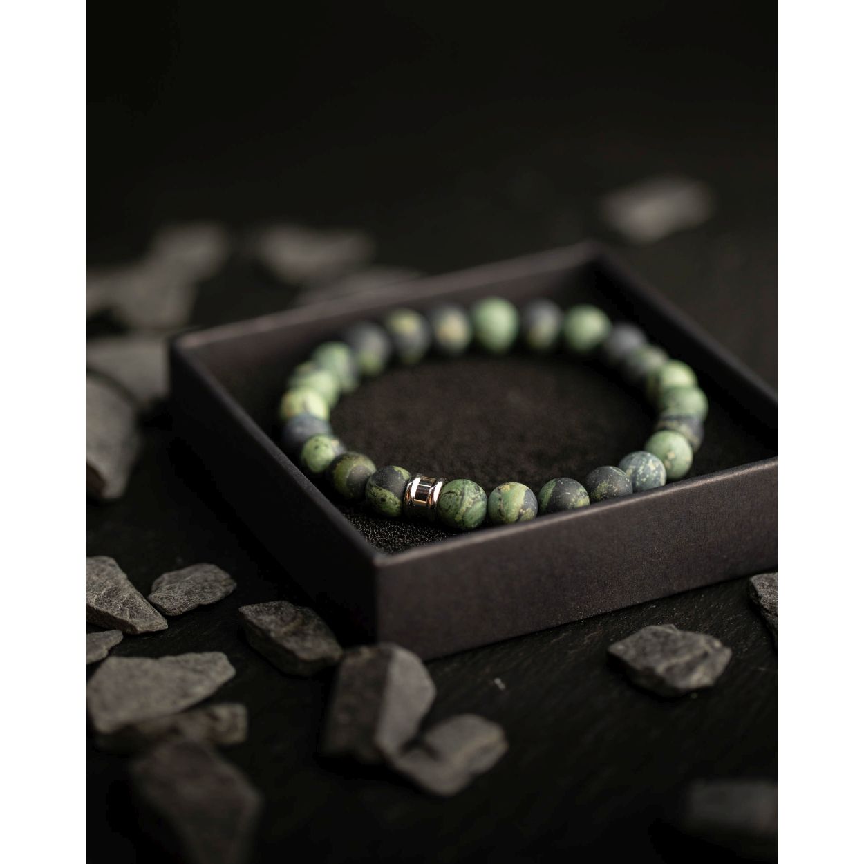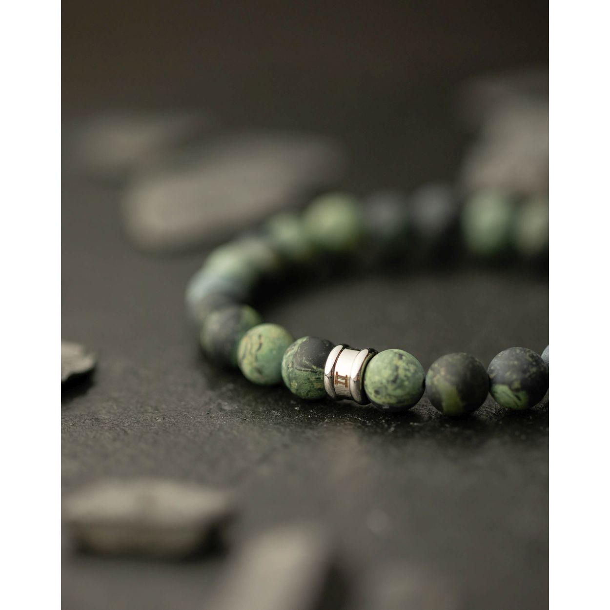 Dit is een Gemini Alpha Mat Green M mannenarmband. Deze heeft een jasper steen.