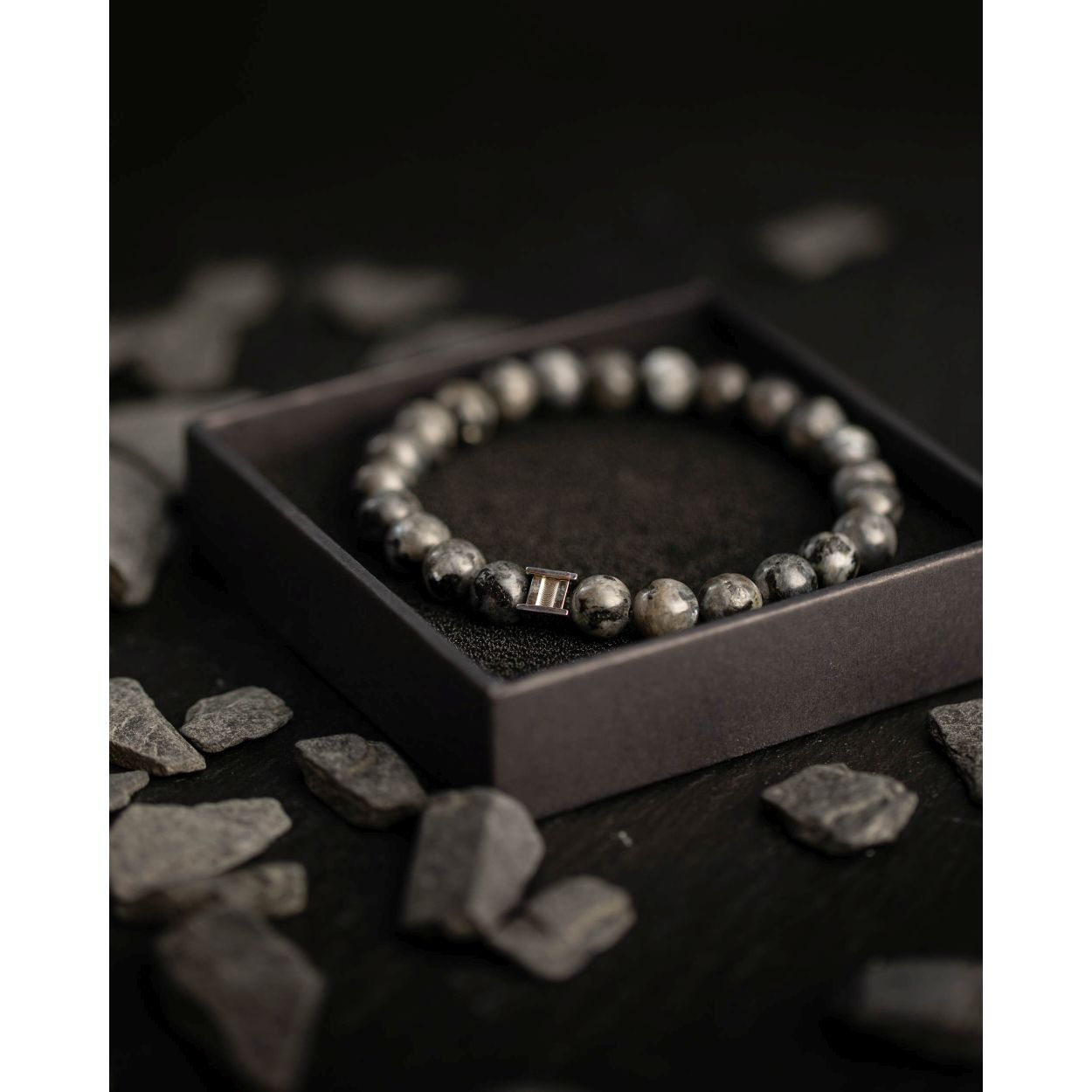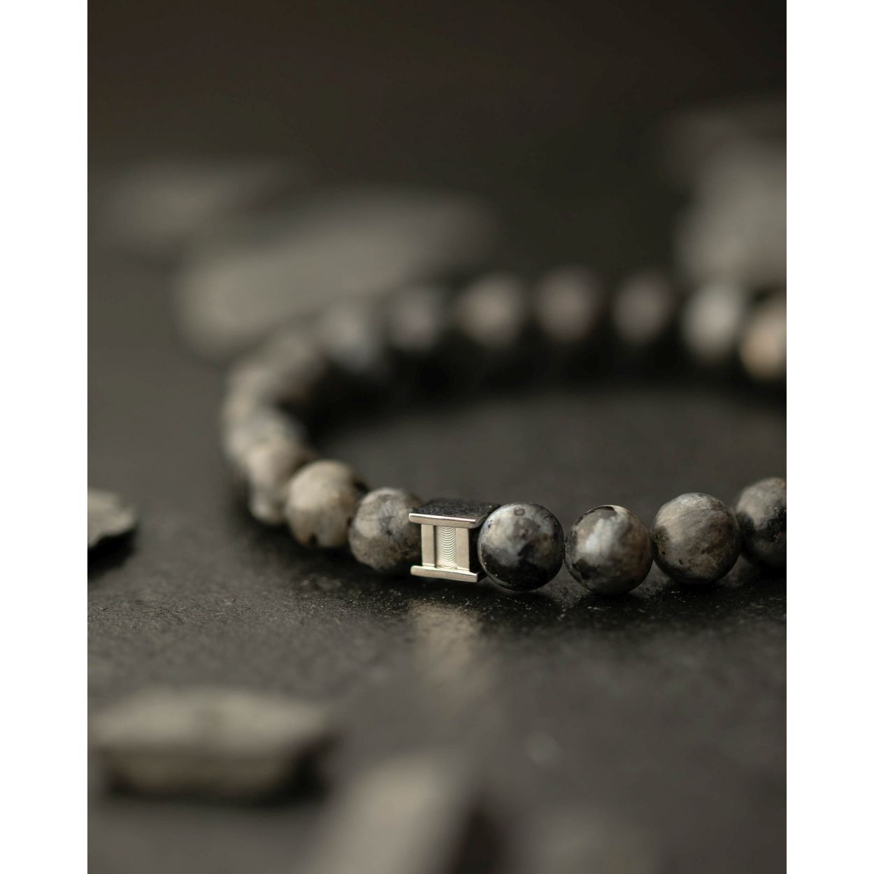 Dit is een Gemini Gem Grey Wolf M mannenarmband. Deze heeft een larvikite steen.