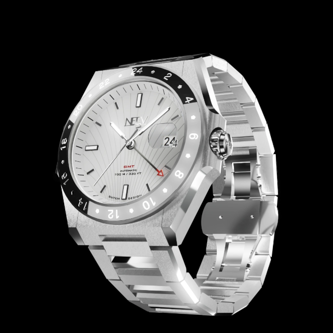 Ontdek de veelzijdigheid van dit prachtige GMT horloge. Dit stijlvolle model is ontworpen voor de reiziger die precisie en elegantie waardeert. Het schitterende staal en met zijn wit gelakte wijzerplaat en kenmerkende NEEV-details biedt dit horloge niet alleen een tijdloze uitstraling, maar ook de functionaliteit van een tweede tijdzone.