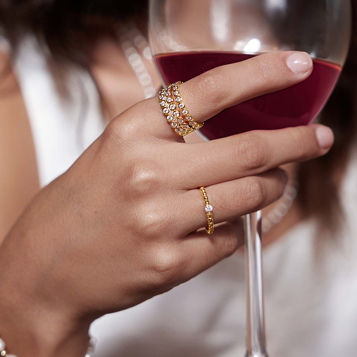 Het prachtige sieraad is gezet met dubbele rijen glinsterende zirkonia's in 14kt verguld sterlingzilver en zal zeker opvallen in elke stapel ringen. Draag hem alleen of gestapeld met andere stukken om verbluffende stijlen te creëren.