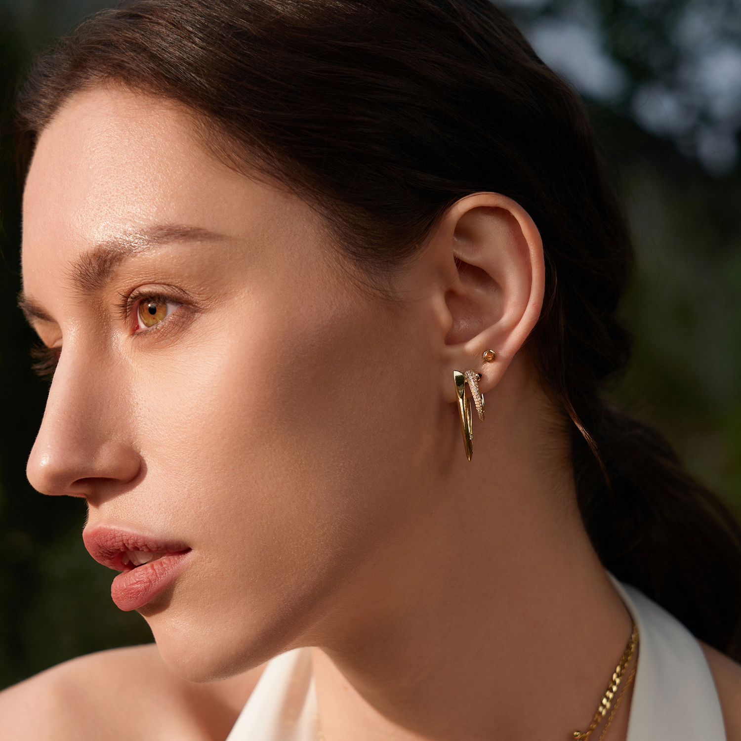 Deze opvallende oorringen zijn gemaakt van 14kt verguld sterlingzilver. Voor een gepolijste punklook met een knipoog naar de millenniumnostalgie, draait het allemaal om de schittering met rijen zirkonia's ingelegd op deze dubbele hoepel. Combineer deze eye-catching oorringen met je favoriete oorbellen of draag ze op zichzelf.