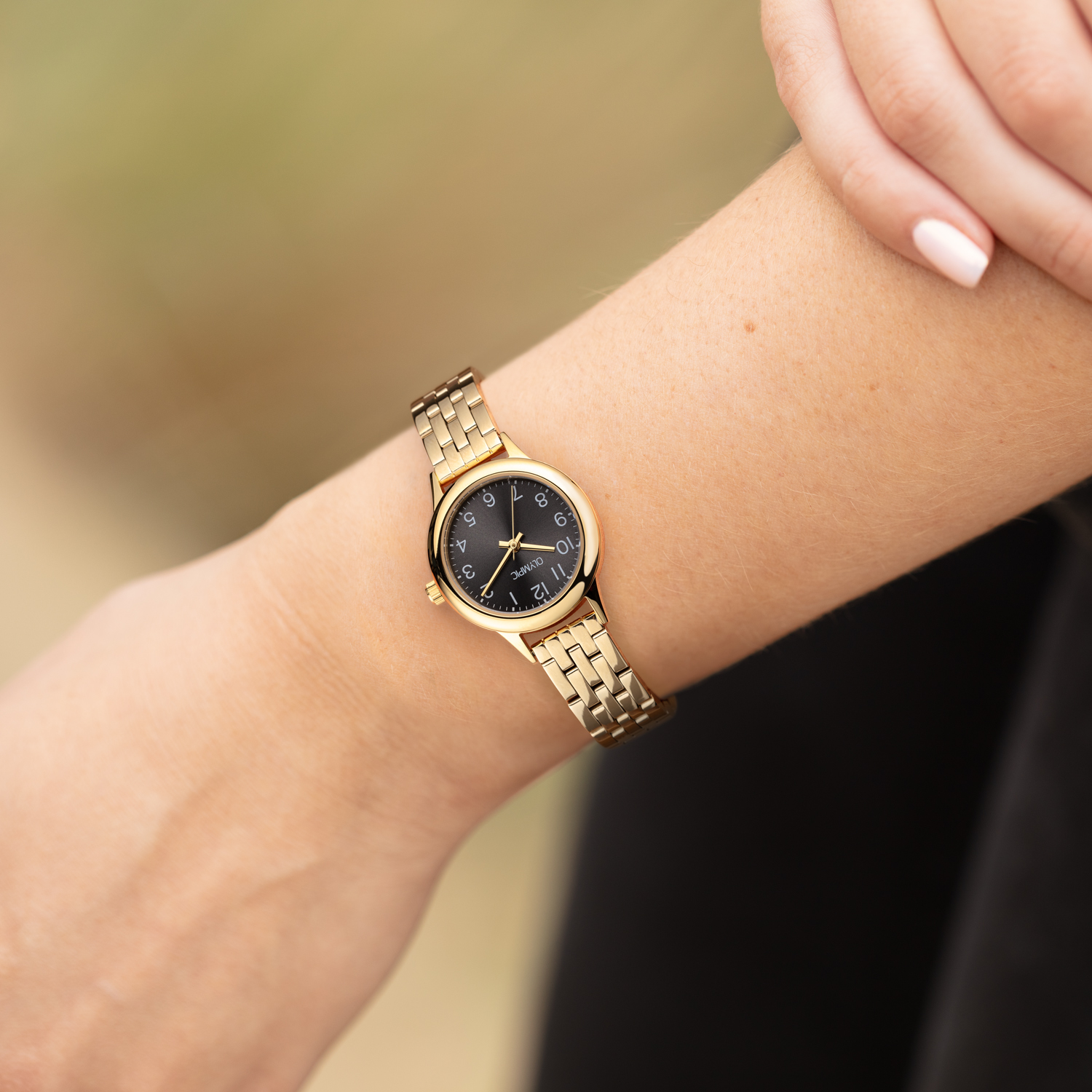 Dit unieke Olympic horloge met artikelnummer: OL80DDD002 is een dameshorloge met een chique uitstraling. Het horloge heeft een ronde goudkleurige stalen kast met een grijze sunray wijzerplaat met cijfers. Aan de kast zit een stalen fijne goudkleurige schakelband met vouwsluiting. Het horloge heeft een mineraalglas, een doorsnee van 28mm en is 5ATM.