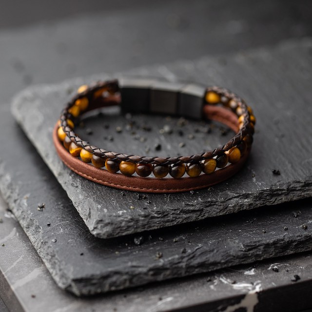 Deze Gemini armband combineert kwalitatief leder met Tiger Eye steen - Maat: M/L (20-21 cm)